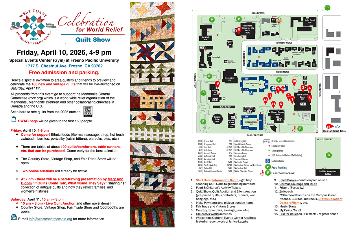 Celebration for World Relief is a group of Mennonite and Anabaptist churches on the West Coast who work together to raise funds for Mennonite Central Committee (MCC) a world relief organization begun by the Mennonite Churches in response to hunger and famine in Russia over a century ago.